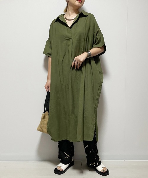 ◆一枚あると助かるさらっとシャツワンピ◆ 柔らかな綿麻素材のワンピース。スキッパーデザインの首元が大人っぽいです。締め付けのないゆったりとした作りで暑い夏も快適に過ごせます。首元のボタンを閉じればシンプルなシャツワンピとしても使えます。一枚でさらりと着られる着丈が嬉しいです。
