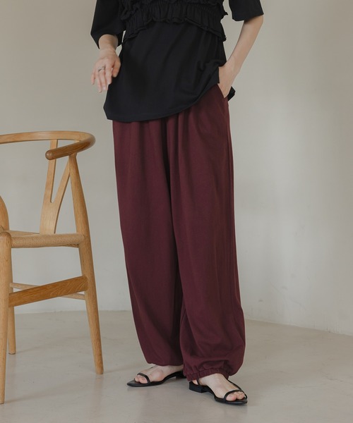 ■素材■ ドライタッチな綿糸を使用した素材です。 アイボリーとグレーカラーにはUSED感を出す製品加工を施し古着のような風合いに仕立てています。 ■デザイン■ ウエストまわりにたっぷりギャザーを入れたカットソー素材のボリュームパンツ。 ギャザーをたくさん入れるために生地をふんだんに使っていますがカットソーなので軽く、 夏の暑い時期でも肌離れも良く快適に着ていただけます。 裾はゴムが入っていて程良くキュッと絞ったデザインに仕上げています。 ウエストオールゴム仕様で履きやすさも抜群!! ■スタイリング■ ボリュームがあるパンツなのでトップスはコンパクトなものがバランスよく着こなせます。 コンパクトなシアーシャツやデザイントップスなどと合わせるのがおすすめ。