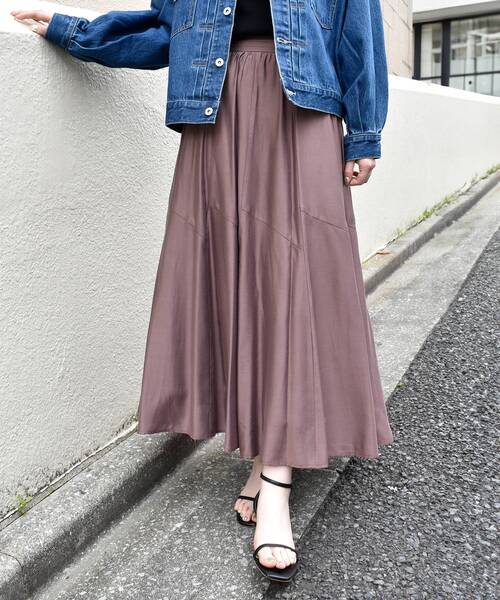 程よい光沢感のあるシルキーローンを使用し、上品な印象のギャザースカート。さりげなく透け感のある素材で、ロング丈でも軽やかに着ていただけます。●ポイント腰まわりはボリュームをおさえ、パネル切り替えで分量を出して、裾に向けて動きのあるシルエットに仕上げました。後ろウエストはゴム仕様でイージーな履き心地。フロントのタックを重ねたベルトデザインが、インスタイルのポイントになります。●おすすめコーデ足元は華奢なシューズからスニーカーまで、その日の気分でテイストを変えて楽しめる幅広いテイストに合うスカートです。【スタッフ着用コメント】〈スタッフA〉40代/151cm/骨格ウェーブ/普段サイズ36‐38/着用サイズ38サイズ感:ウエストはジャストなサイズ感で、着丈は足首ほどの長さ。素材感:程よい光沢感があります。ほんのり透け感のある素材です。着用感:ウエストゴムの仕様で、ストレスフリーの着心地です。軽い素材なので、広がりを抑えたシルエットとなります。※取り扱いについては、商品についている洗濯表示にてご確認下さい。※照明の関係により、実際よりも色味が違って見える場合がありますまたパソコン・スマートフォンなどの環境により、若干製品と画像のカラーが異なる場合もございます。※商品の色味は、商品アップ画像をご参照ください。【注意事項】・画像の商品はサンプルです。・サイズ表記はあくまで目安となります。実際の商品と仕様、加工が若干異なる場合があります。