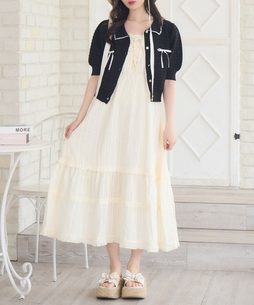 <夏を楽しむ涼しいレースキャミワンピース> ▼デザイン 夏らしいレース素材のキャミワンピース。 胸元はレースアップとリボンデザインがさりげなく、可愛らしいワンポイントに♪ 裾が2段の切り替えになっていて、ふわっと広がるシルエットが女性らしいくコーデを仕上げます。 ▼コーディネート 1枚でスタイリングの完成するワンピース。 上からカーディガンを羽織って、気温調節も◎ 麦わら帽子を合わせてリゾート感を出しても可愛いです。 ------------------------------ 生地感:普通 伸縮性:なし 透け感:なし(ホワイトのみ多少あり) 裏地:ある ------------------------------ ▼ブランド紹介 ems excite (エムズエキサイト) “more fun more cute” 今をもっと楽しく もっと可愛いくいたい女の子に向けた girly cuteなブランド #細見え #ワンピース #リゾートワンピース #フレンチガーリー #夏コーデ #リボン #レース #レースアップ ▼注意事項 ※撮影環境やモニター環境によって実際の商品とお色味が多少異なってみえる場合がございます。 品番:EL580022G001 / 品名:リボンレースロングOP