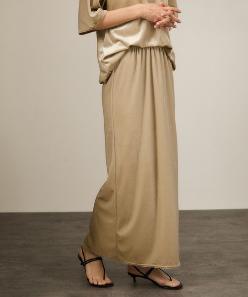シルクの様なしなやかさと上質な光沢感が魅力の、トリアセベロアシリーズ■デザイン/シルエットリッチなベロア素材を生かした、シンプルなナローシルエットのスカート。きれいめな素材をカジュアルなシルエットに仕上げることで様々なシーンに馴染んでくれます。すっきり薄く仕上げるためのウエストゴムは、意匠性がありながらも快適な着心地。バックスリット入りで足さばきもイージーです。上質な表面感で、残暑から寒くなる時期や、春にかけても長いシーズン着用可能なのも嬉しいポイントです。■素材リッチな風合いが特徴のアセテート混のベロアです。シルクの様なしなやかさと発色の良さ、上質な光沢感、軽やかな仕上げで長いシーズン着用可能です。■コーディネート同素材のタンクトップとのセットアップやTシャツなど、カジュアルダウンしたコーディネートもおすすめです。■トリアセベロアシリーズ一覧・商品番号:SHM35440 商品名:トリアセベロア前後2WAYノースリーブ/タンクトップ・商品番号:SHM35430 商品名:トリアセベロアボックスTシャツ・商品番号:SHC35430 商品名:トリアセベロアナロースカート■モデル身長:173cm 着用サイズ:F(ロングヘアモデル)■モデル身長:166cm 着用サイズ:F(ミディアムヘアモデル)-----------------------------裏地:なし光沢感:ありウエスト:ウエストゴムポケット:なし透け感:なし伸縮性:ややあり生地の厚さ:やや薄手-----------------------------