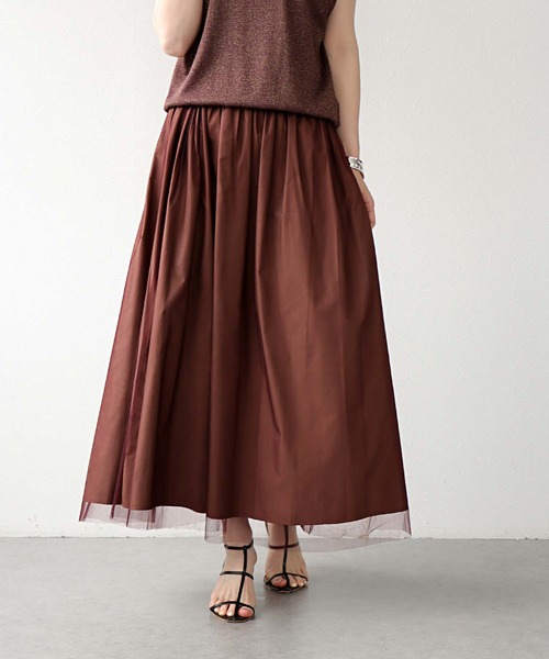 タフタ×チュールギャザースカート 異素材ミックスが目を惹く、タフタとチュールの華やかスカート。 たっぷりとしたギャザーが生み出す動きのあるシルエットと、透け感のバランスが絶妙な一枚です。 ■デザインのポイント ハリ感のあるタフタ素材と軽やかなチュールをレイヤードした、立体感のあるデザイン ギャザーをたっぷり施し、ふわりと広がるフェミニンなシルエット 程よく透けるチュールが、足元を軽やかに見せ、重くならずに抜け感を演出 ウエストはゴム仕様で、快適なフィット感とイージーな着脱が可能 ■素材の魅力 タフタ特有のハリ感がシルエットをキープし、美しいフレアラインを実現 ソフトチュールとの組み合わせで、甘さとシャープさを両立 さらりとした裏地付きで、透けを気にせず着用可能 ■着こなしのヒント シンプルなTシャツを合わせて、甘さを引き算した大人のカジュアルスタイルに ノースリーブブラウスやサマーニットを合わせて、キレイめなお出かけコーデにも◎ スニーカーやフラットシューズでカジュアルダウン、パンプスならよりレディに コンパクトトップスでバランスを取り、スカートのボリューム感を引き立てて 異素材のハーモニーで魅せる、大人のフェミニンスカート。 コーデに立体感と軽やかさをプラスしてくれる、主役級アイテムです。 -------------------------------------- 透け感:なし 裏地:リバーシブル 伸縮性:なし ケア方法:手洗い可 ※お洗濯の際は洗濯表示を必ずご確認ください。 --------------------------------------