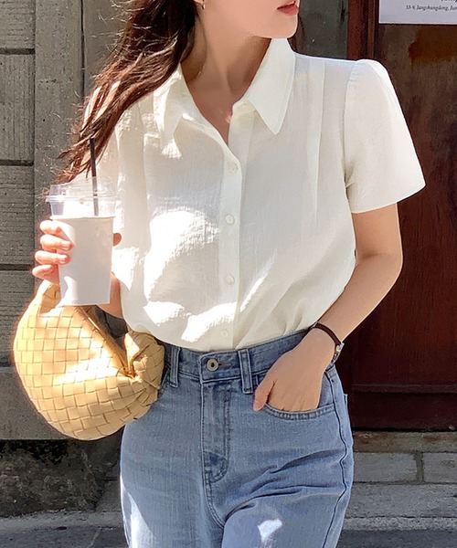 きちんと感と甘さのバランスが絶妙。毎日の着回しに頼れるパフスリーブブラウス。■デザイン・ベーシックで上品な印象のレギュラーカラーが特徴。・さりげないパフスリーブがフェミニンさをプラス。・シンプルながらもきれいめな雰囲気に仕上がる万能デザイン。・襟付きデザインでオンオフ兼用で着回しの利く可愛い1枚。・やや透け感があるので、インナー合わせでレイヤードも楽しめます。■素材・軽やかで涼しげなポリエステル素材。・柔らかな肌触りで快適な着心地。・シワになりにくく、お手入れもラク。■スタイリング・テーパードパンツやスラックスと合わせて、オフィスカジュアルに。・デニムでカジュアルダウンすれば、週末コーデにも◎・パンツやスカートにインしてすっきりと、ショルダーバッグやフラットサンダル、バレエシューズやローファーで小物でトレンド感を抑えた着こなしもおすすめです。-----------------------------透け感:ややあり伸縮性:なし裏地:なし------------------------------------------------------------【スタッフが着用しました!】身長:158cm普段着用サイズ:S~Mサイズ今回着用サイズ:FREEサイズ■着用感・軽やかでさらっとした生地感が夏に最適。・パフスリーブでも肩まわりがもたつかず、動きやすい。・程よくゆとりがありインしたスタイルもお気に入りです◎・きちんと感がありつつ、着心地はストレスフリー。・毎日の通勤やお仕事にも、夏のお出かけや旅行にも持って行きたい1枚です!------------------------------------------------【お買い物をよりお楽しみいただく為に】▼お気に入り登録サイズ・カラーを指定して、♡マークをクリック![セール通知・ラスト1点の通知・完売アイテムの再入荷通知]を受け取ることができます。▼ブランドのお気に入り登録新商品や再入荷、タイムセールやクーポン等いち早くブランドのお得な情報を受け取ることができます。------------------------------------------------※取り扱い上のご注意染色の特性上、発汗や摩擦により色落ちしたり他のものに色移りすることがありますのでご注意ください。韓国 オフィスカジュアル春服 ガーリー大人カジュアル韓国ファッション夏服
