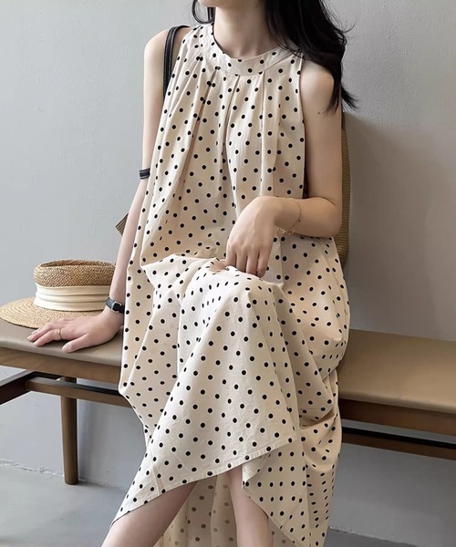大人可愛いを叶える、揺れ感ドットワンピ。■デザイン・クラシカルなドット柄が目を惹くノースリーブワンピース。・さらっと軽い素材感でボディラインを拾わないAラインシルエット・クルーネック&背中のボタン開きで、上品な印象に。・ブラックとベージュの2色展開で、シーンに合わせた着こなしが可能。・膝下丈で露出控えめ&上品なバランス。■素材・ポリエステル100%→ 軽やかでシワになりにくい→ 落ち感があり、動くたびふんわりと揺れるシルエットが魅力→ さらりとした手触りで、夏にも快適な着用感■スタイリング・サンダルやバレエシューズと合わせて、レディライクな夏コーデに。・シアーニットカーデやデニムジャケット、テーラードジャケットを羽織りにレイヤードスタイルも◎季節の変わり目にも対応でき、ロングシーズンで大活躍。・シンプルなバッグや華奢アクセで、柄を引き立てる引き算コーデが今っぽい。・夏のお出かけやレジャー、旅行にもぴったりな1枚-----------------------------透け感:なし伸縮性:なし裏地:なし------------------------------------------------------------【スタッフが着用しました!】身長:158cm普段着用サイズ:S~Mサイズ今回着用サイズ:Mサイズ■着用感・ノースリーブで涼しく、動きやすさも抜群。・身体のラインを拾いにくいフレアシルエットで、楽ちん&きれい見え。・後ろボタン仕様で、着脱もスムーズ。------------------------------------------------【お買い物をよりお楽しみいただく為に】▼お気に入り登録サイズ・カラーを指定して、♡マークをクリック![セール通知・ラスト1点の通知・完売アイテムの再入荷通知]を受け取ることができます。▼ブランドのお気に入り登録新商品や再入荷、タイムセールやクーポン等いち早くブランドのお得な情報を受け取ることができます。------------------------------------------------※取り扱い上のご注意染色の特性上、発汗や摩擦により色落ちしたり他のものに色移りすることがありますのでご注意ください。韓国 オフィスカジュアル春服 ガーリー大人カジュアル韓国ファッション夏服