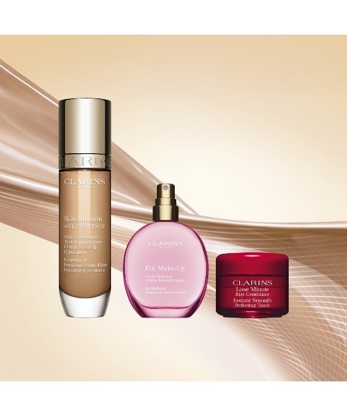 【オンライン限定】崩れにくいクラランスのベースメイクの名品がセットになって登場これからの時期におすすめ、クラランスのベースメイクの名品セットが登場!素肌をケアしつつ、笑っても泣いても汗をかいてもあなたらしい素肌に。◆24時間(*1) 持続する美容液ファンデーション「スキン イリュージョン フルカバレッジ ファンデーション」表情の動きに密着する独自の【スキンフィット テクノロジー】を搭載し、フルカバーなのに薄膜のルミナスマットな仕上がりを実現。さらに、水分油分バランスを整える美容液発想で素肌から美しい印象へ。笑っても泣いても怒っても。肌はどんな時でも美しく。◆メイクの仕上がりをキープし、素肌までケアする「フィックス メイクアップ N」シリーズ最高傑作(*2)。2種のローズ(*3)とキイチゴ(*4)を凝縮した、超微粒子ミストが肌を包み込み、24時間(*1)メイクを美しくキープし、素肌までケアする今年新しくなったフィニッシングミスト。スキンケア成分 97%で、長時間保湿。素肌のうるおいバランスまで整え、うるおったツヤ肌へ導きます。◆部分用メイクアップベース下地「スムース パーフェクティング タッチ」毛穴・小ジワなど気になる部分をサラッとなめらか肌へと瞬時に整える、クラランスの部分用メイクアップベース下地。アカシアミクロパール配合により、うるおいを閉じ込めて保湿感と心地よい感触もキープします。<セット内容>「スキン イリュージョン フルカバレッジ ファンデーション」 30mL 現品(色番103、105、106からお選びください) 「フィックス メイクアップ N」 15mL トライアルサイズ 「スムース パーフェクティング タッチ」 4g トライアルサイズ (*1) 化粧持ちデータ取得済み。クラランス 調べ。効果には個人差があります。(*2) クラランス フィックス メイクアップにおいて。(*3) ロドデンドロンフェルギネウムエキス(整肌成分)、ダマスクバラエキス(香料)(*4) ヨーロッパキイチゴ果実水 (整肌成分)