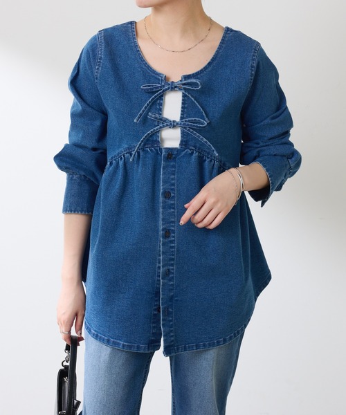 360度どこから見ても着映えるデニムチュニック【POINT】・前後2WAYで着ていただけるスタイリングの主役になるデニムチュニック。・伸縮性のある生地を使用しているので、見た目の割にストレスフリーな着心地◎・リボンやペプラムなど一見甘く見えそうなデザインですが、デニムなので程よくカジュアルダウンされます。・腰回りまで隠れる着丈なので体形カバーしつつ、オシャレ見えが叶うアイテムです。【おすすめコーディネート】1枚でボリューム感があるので、細身のセミフレアシルエットや、テーパードなどと合わせるとスタイル良く着こなせます。【おすすめのスタイリングアイテム】・セルフカットデニム CLQ5052103A0002・シュリンクタイトスカート CLZ1051701A0001【素材】《ブルー》綿56%, ポリエステル32%, レーヨン10%, ポリウレタン2%《ブラック》綿-62% ポリエステル34%, レーヨン2%, ポリウレタン2%透け感:なし裏地:なし伸縮性:あり光沢感:なし洗濯:洗濯機可(弱)【Q.anos/キュアノス】22SSから立ち上がったコラージュデニムブランド、Q.anos。ヴィンテージデニムから感じられるラフさと、女性らしさをバランスよく兼ね備えたアイテムを手掛けます。カジュアルダウンではなくカジュアルアップし高揚感が得られるデザインが特徴。トップス次第で季節問わず長く着て頂けるのも魅力のひとつ。ジャンル問わず幅広いスタイリングで着て頂けるアイテムを展開。【気になる商品は「お気に入り」登録を】 ハートマークをクリックし、お好きなカラーを選んでお気に入りに登録すると入荷情報や残り1点の通知、完売カラーの再入荷、セール情報などを受け取ることができます。※撮影場所やお使いのモニター環境により若干お色味が異なる場合がございます。特にロケの撮影では明るく見える傾向にございます。詳細撮影画像で色味をお確かめくださいます様お願いいたします。※サンプルで撮影をしております。若干の仕様が変更になる場合がございますので予めご了承の上ご注文くださいますようお願いいたします。※サンプルでの採寸のためあくまで目安となります。予めご了承ください。