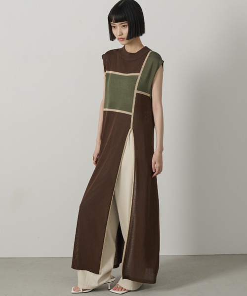 ー ディテール ーブロッキングカラーと深めのスリットがメリハリのあるロングワンピース。程よい透け感のシアーニットでこれからの時期涼しく着用していただけます。ボディラインを拾わないタイトすぎないシルエットも着用しやすいポイントです。【色味に関しての注意事項】商品画像は、ストロボなど撮影機器の使用や光の当たり具合、お使いのスマートフォンやパソコンなどの閲覧環境により、実際の色味と異なって見える場合がございます。予めご了承ください。【SNS動画掲載アイテム】@aic_official上記の公式インスタグラムアカウントにて着回し動画を掲載しております。是非ご覧くださいませ。★お取り扱い注意事項★下記をご確認いただきご了承の上、ご購入ください。・この商品は伸びやすいニットアイテムです。保管の際は必ず吊りではなく、平置きで保管するようにお願いします。・ニット製品は伸びやすいため、サイズ等が色により誤差が生じる場合がございます・着用中の摩擦などにより、ピリング(毛玉)が生じる場合があります。・洗濯の際は色落ちしますので単独で洗い、湿気を含んだ状態や水につけたままで放置しないでください。・濃色の製品は、摩擦や汗、雨などで濡れると、ほかの衣料に色移りする場合がございますので、充分ご注意ください。・商品の写真はサンプル品を撮影している為、実際の商品とは仕様や加工、加工によるダメージ、サイズ等が若干異なる場合もございます。・初回販売分と生産時期の異なる商品は、色味や加工等若干異なる場合がございます。・システムの都合上下げ札の税込み価格表記が商品ページの税込み価格と1円ずれている場合がございます。・掲載画像の商品の色味は、屋外や屋内の光の照射や角度により実物と色味が異なる場合がございます。また表示のサイズ感と実物は若干異なる場合もございますので、 ・着用、お取り扱いの際は、商品についている品質表示とアテンションタグを必ずご確認下さい。