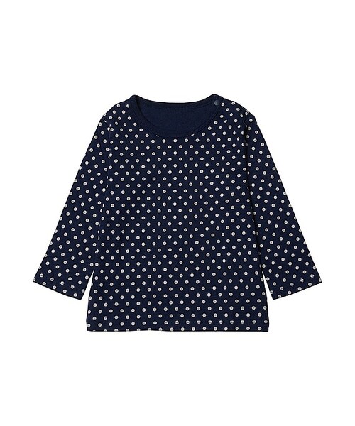 お肌のデリケートな赤ちゃんにも安心なコットン100%のTシャツ。スムース素材という、よりなめらかな素材を使っています。デザインは定番のドット柄。やさしいカラーリングが赤ちゃんによく似合います。全サイズ左肩はスナップボタンで大きく開くので、着せ替えが簡単にできます。定番のTシャツなので、お着替え用に何枚か持っておくと便利です。