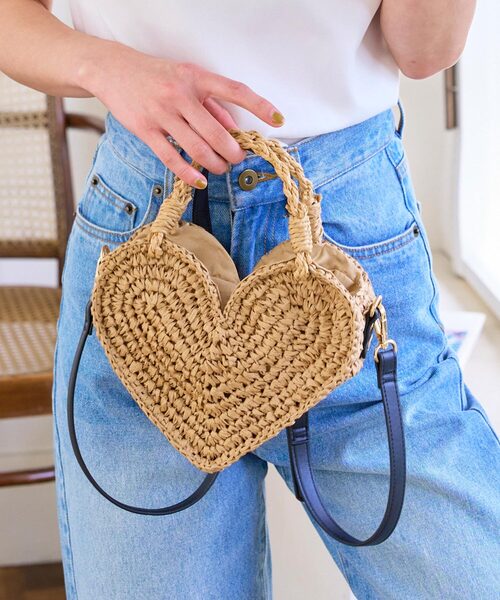 ハート型がかわいいキャッチーなかごバッグ。ナチュラルな雑材素材で甘くなりすぎず、浴衣や水着などシーズンスタイルのポイント合わせにもオススメ。取り外し可能なショルダーベルト付きでハンズフリーでもお持ちいただけます◎【素材・サイズ感】軽くて風合いあるペーパー素材。マチのある立体フォルムで見た目以上の収納力。口元は巾着タイプなので中身を見せずにしっかりカバー。涼し気な表情がサマースタイルにぴったりなシーズンアイテムです。【STAFFコメント】ナチュラルな風合いが大人可愛いかごバッグ。ショルダーバッグとハンドバッグの2way仕様◎取り外し可能な肩紐は長さ調整できるのも嬉しいポイント♪デイリー使いはもちろん、お祭りや花火大会など夏のイベントの際のゆかた合わせにもおすすめです。※【伸縮】なし/【淡色透け】なし/【濃色透け】なし/【裏地】あり《KOBE LETTUCE ー神戸レタスー》 プチプラレディースファッションからコスメまで、トレンドアイテムを豊富に取り揃えております。 毎シーズン発売されるインフルエンサーとのコラボ商品はSNSでも話題に。