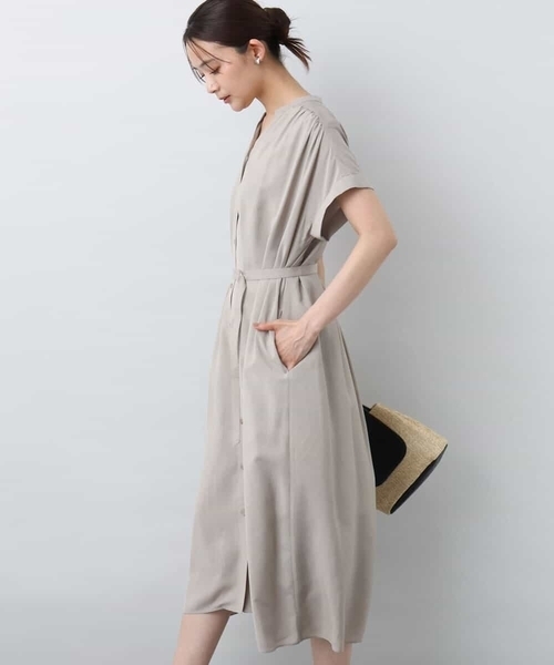雰囲気を変えて着こなしの幅を楽しめる2wayワンピース ■デザイン リラクシーなシルエットと程よく開いたキーネックデザインが首周りをすっきりと見せてくれるワンピース。着脱のラクチンな前釦仕様で、両脇ポケット付きも嬉しい。 ■素材 ドライタッチで清涼感のある素材を使用。落ち感がある素材は広がりすぎず、きれいめな印象で着こなせます。やや透け感のある素材ですが、裏地付きなので安心して着用いただけます。 ■コーディネート ベルトでウエストマークをしてエレガンスな雰囲気で着こなしたり、ベルトなしでラフな着こなしも両方楽しめます。前釦をすべて開けて羽織りものとしての着こなしもおすすめ。 -------------------- 着用シーズン 春:○ 夏:◎ 秋:× 冬:× -------------------- 洗濯表示:手洗い可 透け感:ややあり 裏地:あり 伸縮性:なし 生地の厚さ:やや薄手 -------------------- ※自然光・照明の関係、パソコン・スマートフォンなどの環境により、実際と色味が違って見える場合がございます。予めご了承ください。商品の色味は、詳細画像をご参照ください。 ※サンプルでの撮影となるため、実際にお届けする商品と仕様やサイズが異なる場合がございます。
