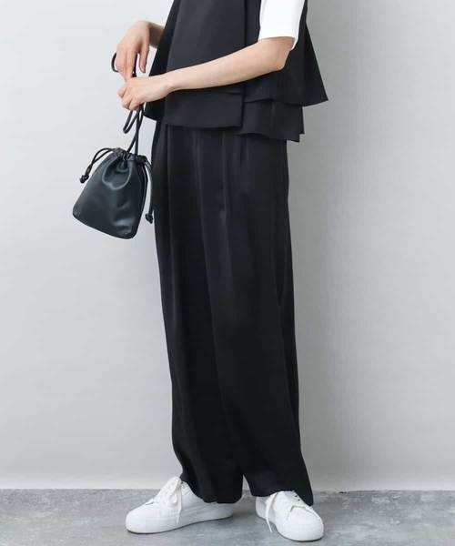 凹凸のある表面感が新鮮なワイドパンツ ■デザイン 2タックのプルオンタイプがラクな着心地のワイドパンツ。ラクチンですが、すっきりとしたシルエットに見えるようにパターンで調整し、大人カジュアルに着こなしやすく仕上げました。 ■素材 表面感のあるハンマーサテンの素材を使用。程よい光沢感と凹凸感があり、さらりと着心地の良い肌触りです。 ■コーディネート シンプルなワイドパンツは着こなしの幅も魅力。表面感がある素材はシンプルなトップスと合わせるだけでこなれ感のあるコーディネートに。同素材のキャミビスチェとセットアップでの着こなしもおすすめです。 -------------------- 着用シーズン 春:○ 夏:◎ 秋:○ 冬:× -------------------- 洗濯表示:洗濯機洗い可 透け感:なし 裏地:なし 伸縮性:ややあり ウエスト:後ろゴム仕様 生地の厚さ:やや薄手 -------------------- ※自然光・照明の関係、パソコン・スマートフォンなどの環境により、実際と色味が違って見える場合がございます。予めご了承ください。商品の色味は、詳細画像をご参照ください。 ※サンプルでの撮影となるため、実際にお届けする商品と仕様やサイズが異なる場合がございます。