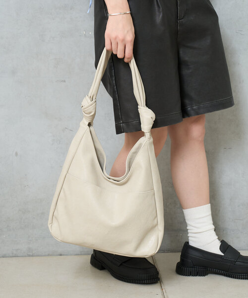 結び目がデザインのポイントのワンショルダーバッグ高見えするスムースのフェイクレザーを使用したワンショルダーバッグ。マチがしっかりあり、見た目以上に収納することができます。背面にポケットが付いているので、すぐに取り出したいものや小物の収納に便利です。きれいめからカジュアルまで幅広いコーデにマッチ。通勤バッグとしても◎