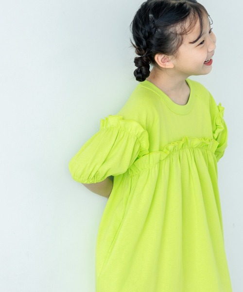 【デザイン&スタイリング】 コットン素材のフリルワンピース。 去年も人気だったフリルワンピースをアップデート! 胸元とショルダー部分に甘さ控え目のフリルをON。 ローリーキッズらしく、甘すぎない着やすい1枚に仕上がっています! レギンスやフレアパンツとレイヤードしてもカワイイ。 夏らしい元気カラーの展開になっています♪