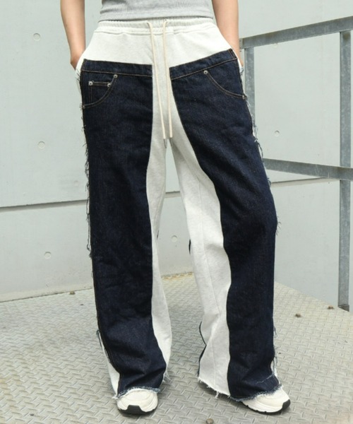昨年大人気、完売していたアイテムに新色が登場!! スウェットパンツにデニムをドッキング。 ウォッシュのかかったデニムにギザギザのステッチを施し他にはないデザインに。 細かなタックで立体的なシルエットに仕上げ、一本でFIG&VIPERらしい主役級のアイテム。 デニム部分はカットオフで洗っていくうちにサイドのフリンジが出て経年変化を楽しめます。 ウエストゴム、紐あり、両サイドとバックにポケット付き(デニム部分もポケット有) ※裾は切りっぱなしにしており、お好きな長さにカットして着用いただけます。 【 コーディネート 】 ウエスト部分を折り曲げてローライズで履くのが今年らしくおすすめ。 タイトなトップスにボリュームのあるスニーカーでストリートライクなコーディネートが完成。 【着用モデル】 身長:165cm(ダークブルー) 身長:155cm(ブルー) ********************** 透け感:なし 裏地:なし 伸縮性:スウェット部分にあり 生地の厚さ:厚手 ********************** 【スタッフ着用コメント】 《スタッフ①》 身長:165cm/体型:普通/普段サイズ:M/着用サイズ:FREE サイズ感:ゆとりがある 素材感:厚みがありしっかりとした生地感 着心地:リラックスムードで着用できるのにカジュアルになりすぎなくて良い。 165cmの私は裾を切らずにウエスト部分を一度折り返しローライズで履いています。 ********************** 【スタッフ着用コメント】 《スタッフ①》 身長:155cm/体型:普通/普段サイズ:S/着用サイズ:FREE サイズ感:ワイド 素材感:肌にあたる部分はスウェットなので柔らかい 着心地: 裾を5cm切ってスニーカーで履けます ********************** ■公式インスタグラム【figandviper】ZOZOTOWNに掲載してない入荷情報や着用感など随時更新しております。 是非チェックしてみてください。 ▼商品のお気に入り登録お気に入りアイテムの値下げ・再入荷・在庫1点などの通知を受け取ることができます。 ▼ブランドのお気に入り登録新商品や再入荷、セール、クーポン配布などお得な情報を受け取ることができます。 ※画像の商品はサンプルです。実際の商品と仕様・加工・サイズが若干異なる場合がございます。※照明の関係により、実際よりも色味が違って見える場合があります。またパソコン・スマートフォンなどの環境により、若干製品と画像のカラーが異なる場合もございます。予めご了承くださいませ。