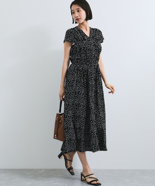 ◆2025春夏◆ <POINT> ・シャツ型をベースにしているのでオンオフで使用可能! ・身頃のシャーリングデザインが華やかさをUP ・前開き仕様で羽織でも使えます ・WEB限定で着丈違いのサイズ展開あり ※PFサイズはWEB限定。 Fサイズより8cm短い丈となります。(着丈以外は同じサイズ) 【デザイン・シルエット】 シルエットは広がり過ぎないスマートなシルエット。 涼し気でリラックして着用できるようにネックデザインは緩いVネックにしています。 身体のラインを拾い過ぎないので、暑い夏でもリラックスして着用できます。 【素材】 無地はシャーリングと相性が良いように固すぎず、柔らかすぎないコシのあるオリジナルのシャツ生地。 ドット柄はさらっとして清涼感のある軽い素材感。 【カラー】 無地でブラウン、ブルー、ブラックはドット柄の3色展開。 【おすすめのスタイリング】 1枚でさらっと華奢なサンダルやスニーカーなどと合わせてスタイリングするのがおすすめです。 前開きのデザインなので、羽織として着用も可能。 アクティブに動かれる際はデニムとタンクにさらっと羽織るスタイリングもおすすめです。 ----------------------------- 裏地:なし 光沢感:なし 透け感:なし(col,45はペチコート等合わせていただくと安心して着用いただけます) 伸縮性:なし ファスナー:後ろにあり ポケット:あり ボタン:あり(開閉可) 生地の厚さ:やや薄手 季節:春、夏、初秋 ----------------------------- 【モデル着用サイズ】 全色モデル身長:165cm、着用サイズ:F ※PFサイズはWEB店舗限定の商品です。実店舗での販売はしておりません。 ※画像の商品はサンプルです。 実際の商品と仕様、加工、サイズが若干異なる場合がございます。 ※画像によっては実際の色味と異なる場合があります。正しい色味は生地アップ画像をご確認ください。