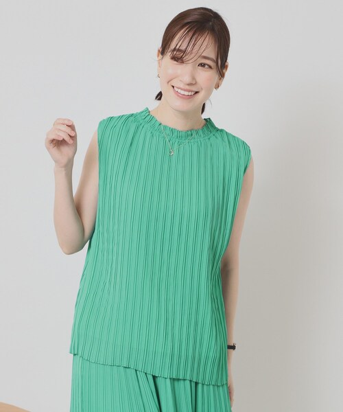 【デザイン】 楊柳素材の軽やかなプリーツブラウス。 スタンドフリル襟で顔周り華やか見え。 繊細な楊柳素材にプリーツ加工を施したふんわり軽やかなブラウス。 ほんのりクラシカルな印象のスタンドフリル衿がきちんと感をプラス。 きれいめスタイルはもちろん、デニム合わせでカジュアルMIXさせたコーデもおすすめ。 ジャージー素材の裏地付きなので透けを気にせず一枚で着やすく肌当たりも◎ 大人可愛いドット柄と、コーディネートのアクセントになる鮮やかな無地カラーの展開。 同素材のスカート【P93-62524】もあるのでセットアップでの着用も可能です。 【素材】 ポリエステルの楊柳素材にプリーツ加工を施した軽やかな素材。 ※照明の関係により、実際よりも色味が違って見える場合があります。また、パソコン・スマートフォンなどの環境により、若干製品と画像のカラーが異なる場合もございます。 ---------------------------------------- ★お気に入り登録がおすすめ★ ▽気になる商品はハートマークをクリック! ・再入荷やセールの通知をお知らせ ・お気に入り一覧からいつでもチェック ▽ブランドのお気に入り登録も! ・新商品やお得な情報をいち早くお知らせ ---------------------------------------- モデル情報:身長166cm B80 W59 H85 着用サイズ:00(フリーサイズ) 店舗へのお問い合わせ商品番号:P93-52533 ●製品寸法: 00(フリーサイズ):着丈60cm B92cm 裄丈37cm 備考: