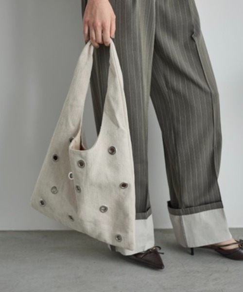 THE YOn 2025 Summer Collection モードなデザインが魅力のトートバッグ 【Design】 コットン素材のヘリンボーン生地で、シーズンライクな表情に仕上げたトートバッグ。 ハトメをランダムにあしらった、エッジの効いたデザインが魅力。 A4サイズが収納出来る容量に、内ポケット付きと機能性も充実。 ワンショルダーでモードな雰囲気にまとめました。 【Styling Point】 カジュアルなスタイルはもちろん、きれいめスタイルの外しにも◎ ペットボトルや日傘など、荷物の増えるこれからの季節に最適なアイテム。 ----------------------- 裏地:あり 光沢感:なし 透け感:なし 伸縮性:なし ---------------------- 【お買い物をお楽しみいただく為に】 ▼お気に入り登録をオススメ致します。 『♡』をクリックして下さい。 ・《商品のお気に入り登録》で再入荷通知や、ラスト1点の通知、セールの際の通知も受け取ることができます。 ・《ブランドのお気に入り登録》で新作商品や再入荷など、お得な情報を受け取ることができます。 【ATTENTION】 ※画像の商品はサンプルです。 実際の商品と色味、仕様、加工、サイズ、素材等が若干異なる場合がございます。 ※撮影場所やお使いのモニター環境により若干お色味が異なる場合がございます。 ※製品によっては染料の特性上、湿った状態や汗をかいた状態での長時間の放置、または摩擦により、他のものへ色移りする恐れがありますので、着用時にはご注意下さい。 ※風通しがよく、湿気の少ない日の当たらない場所で保管して下さい。 ※また製品加工上、お手元に届く際に匂いが生じる場合がありますが、 ご使用を続けていく事により匂いは軽減されます。