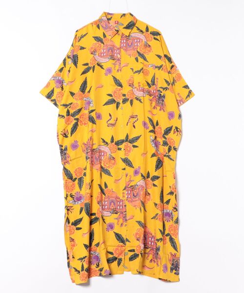 旅するカラベラたちがゾウに乗ってインドへ訪問。お祭りなどに欠かせない神聖な花、マリーゴールドを散りばめたデザイン。メキシコとインドのモチーフが融合した華やかなアロハシャツワンピース。両サイドのスリットで着やすさアップ。さらりと着られる涼やかなレーヨン素材で、カラフルな夏コーデに◎・両サイドポケット付き。※こちらの商品は1点1点職人による手作りとなります。その為、生地の取り方により柄の配置や形・色合いなど若干個体差がございます。(画像は一例です。)あらかじめご了承ください。Amina Collection Co.,LTD.