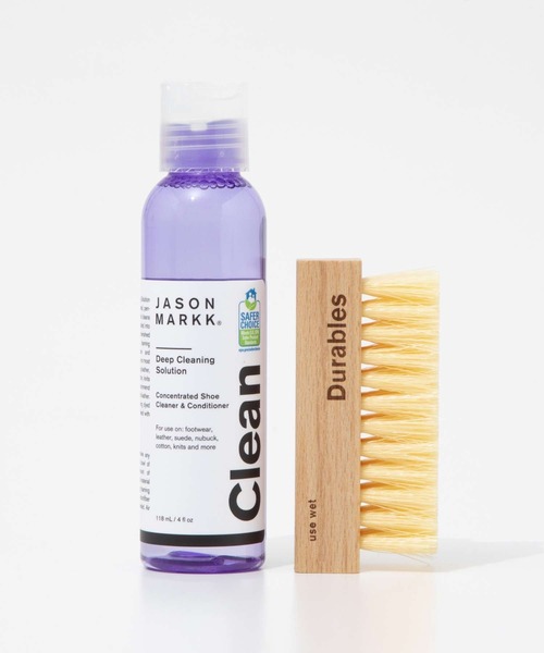 主成分が天然由来の4 oz. プレミアムディープクリーニングソリューションとスタンダードクリーニングブラシが入ったキット。 優しく泡立つ洗剤が、付着した汚れを効果的に落とします。 レザー、スウェード、ヌバック、ナイロン、キャンバス、コットン、ニットなど様々な素材や色に安心してご使用いただけます。 スタンダードクリーニングブラシは、硬くて丈夫な合成繊維毛を採用し、しつこい汚れの洗浄に効果的なブラシです。 ・4 oz.プレミアムディープクリーニングソリューション 118ml(スニーカー洗浄約100足分) ・スタンダードクリーニングブラシ(ミッドソールやアンダーソールなどのクリーニングに最適) DIRECTIONS 乾いたブラシ(豚毛、馬毛等)で素材表面のホコリや汚れを取り除きます。 ボウルに張った水にブラシを浸してから、適量のソリューションをブラシに付けます。 ブラシを再度水に浸したあと、余分な水気を切ります。 泡立てながら汚れている箇所をブラッシングし、マイクロファイバータオルできれいに拭き取ってください。 必要に応じてこの工程を繰り返し、終了後に自然乾燥させます。 ※コーティングをされていないレザーや色止めを施されていないレザーのクリーニングにはお勧めしません。 染色されたスウェードは水に触れただけで色落ちや染料がにじむ場合があるため特にご注意ください。 スウェード、ヌバック、キャンバス、コットン、メッシュ、ニットなどのデリケート素材のクリーニングには、プレミアムクリーニングブラシ(別売り)をご使用ください。 JASON MARKK ジェイソンマークは大切なモノをケアできる製品の必要性を感じ、2007年に設立。 「最適なケアが愛用品を長持ちさせ、そのケアが未来を見据えた時に自身にも環境にも適切な方法である。」これが考え抜いたアプローチ方法。 製品やブランドを通して多くの人に伝わることを願い、また、それが正しい行動であるのだと証明されることを信じています。 ※海外の正規ルートからの並行輸入品です。 ※同一商品であっても仕様が変更される場合がございます。 ※生産時期やカラーによって原産国が異なる場合がございます。 《お買い物をよりお楽しみいただくために》 ◆商品のお気に入り登録♪ ハートマークをクリックすると完売カラーの再入荷や、ラスト1点の通知、セールの際の通知を受ける事ができます。 ◆ブランドのお気に入り登録♪ 新商品や再入荷などの情報を受け取ることができます!是非ご登録ください♪