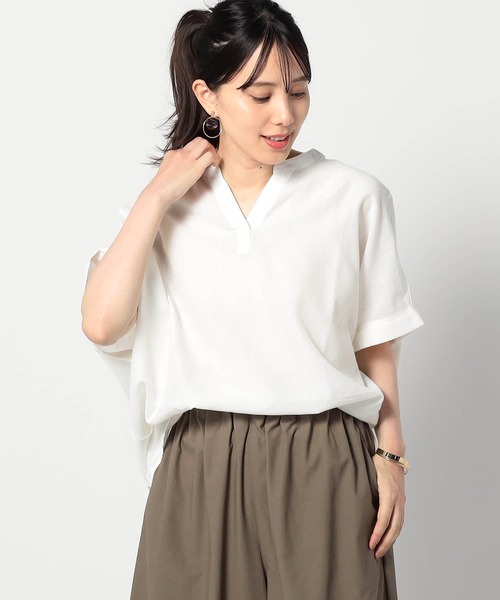 爽やか吸水速乾リネン スキッパーシャツ 柔らかくさらさらが続く、お手入れ簡単なリネン混素材を使用しています。 通気性が良いリネンにレーヨンのなめらかさを合わせた機能性素材で、暑い季節に快適に着用出来る吸水速乾の素材を使用したスキッパー衿のドルマンシャツです。 ■point ゆったりとしたオーバーシルエットのドルマンシャツです。 着用するとダブルに折り返された袖が肘辺りまでかぶるので、袖が短すぎず安心感があります。 上品なややハリのあるリネンの裾にタックが入り、着るだけで形が決まります。 ベーシックなテーパードボトムやスラックスと合わせるとカジュアル通勤も可能です。 ■detail *ウォッシャブルなので汗をかく季節もお手入れ簡単です。 *吸水速乾なので、夏に快適に着用出来ます。 *お尻が軽く隠れるくらいの着丈 ■fabric …………………… 透け感:白あり 裏地:なし 伸縮性:なし 光沢感:なし 生地の厚さ:薄い 洗濯方法:洗濯機洗い可能 …………………… 5407-8001.8002と同じ素材を使用したシリーズです。 ※詳しいお手入れ方法は商品タグをご参照ください ■coordinate *ワイドボトムやスカートと合わせてカジュアルに。 *テーパードパンツやベーシックボトムと合わせて通勤にも使用可能です。 *着用時、ブラウスをボトムにタックインした着こなしも素敵です。