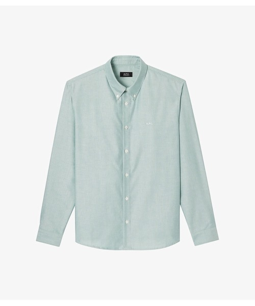 ボタンダウンカラーのベージュストライプシャツ.*ストレートカット.*軽いスロッピングショルダー.*ボタンダウンカラー.*左胸に同色のA.P.C.ロゴ刺繍.