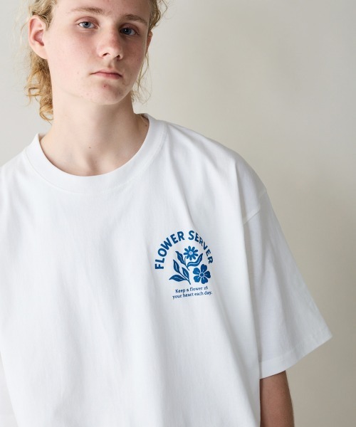 【 生地 】6.6ozのしっかりした生地厚で、ざっくりとした風合いが魅力の16/-天竺(空紡糸)を使用しています。 ドライタッチが心地よく湿気の多い日本において活躍する素材です。 -------------------------------------------------- 裏地:なし 透け感:なし 生地の伸び:ナチュラルストレッチのみ 光沢感:なし ケア方法:洗濯機洗い可 -------------------------------------------------- 【 デザイン・シルエット 】 フロントには小ぶりな花柄と「FLOWER SERVER」のメッセージ、バックには蝶の羽にバラが咲き誇るグラフィックを大胆に配置した、印象的な一着です。 “FLY OWN WINGS(自分の翼で飛べ)”という言葉に、「You were made to bloom(あなたは咲くために生まれた)」というメッセージを添え、日々の背中をそっと押してくれるようなデザインに仕上げています。 ボディには、ざっくりとした風合いが魅力の16/-天竺(空紡糸)を使用。程よい厚みとドライタッチが心地よく、洗うほどに風合いが増すのも魅力です。ゆったりとしたリラックスフィットで、一枚着としてもレイヤードのベースとしても活躍します。