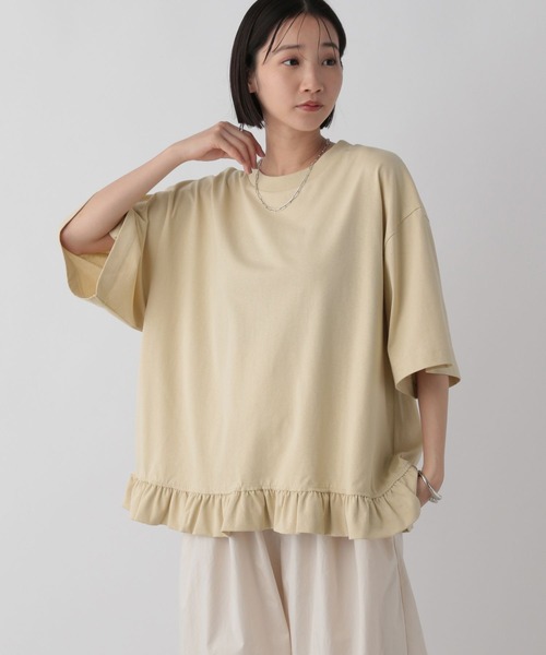 ■素材■ カジュアルな風合いが特徴の糸を使用したUSA綿100%の素材を使用しています。 ■デザイン■ 裾のフリルデザインが特徴のフリルTシャツ。 長短の展開になっており、お好きな長さをお選びいただけます。 甘めなデザインですが、カジュアルな素材を使用し、甘くなり過ぎず、カジュアルコーデにもおすすめのアイテムです。 ■スタイリング■ デニムなどカジュアルなボトムスや、ワイドパンツなど様々なボトムとの相性が〇。 一枚でスタイリングの主役になってくれるアイテムです。