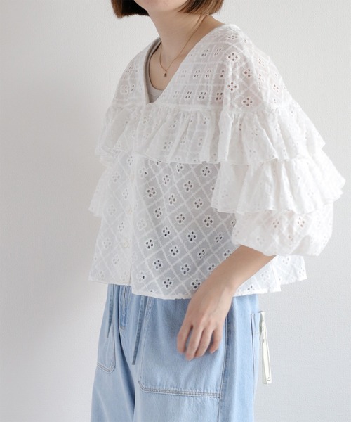 フリルとレースが大人な可愛さと爽やかさを演出してくれるレースシャツ☺︎ とても涼しげで着るだけでコーディネートに夏らしさがプラスできます♩ ◇Point◇ フロントとバック、またボリュームスリーブに施したフリルが女性らしさをアピール。 フリルに細かいお花柄がたっぷり入っているのもポイント☺︎ボタンを開けてカーディガンとしてもお使いいただけます♩ ゆとりのあるシャツなので、スタイルカバーもお手の物。大人の女性でも、可愛くなりすぎないフェミニンさです♩ かわいらしさとニュアンスを詰め込んだデザインなので合わせやすく春夏に一着はマストで持っていたいトップスアイテムです。 長袖なのでクーラーが効いた部屋や電車などにもカーディガンとしても使えるアイテム◎ しわになりにくい素材ので、鞄にくるくるっと丸めて入れておくととっても便利です! ◇Material◇ ⚫︎注目は、小さいお花柄と透け感♩画像で見てみてくださいね! ⚫︎ふわっと軽やかな着心地、シワにもなりずらい生地です♪ ⚫︎袖口にゴムを使用しているので、お好みの丈感に調節可能 ⚫︎着丈を短めにしているので、様々な形のボトムスと合わせやすい◎ ⚫︎首元をVネックデザインにすることで、可愛さの中に女性らしさをプラス+ ⚫︎ボタンの色も生地に合わせているのがキュンポイント◎ ◇Coordinate◇ ・シンプルなタンクトップやブラトップの上にサラッと着こなせる! ・カットソーやTシャツの上に羽織って、カーディガンとして大人女子コーデに♪ ・ひんやり涼しいデニムパンツ(CCB-0447)と合わせてカジュアルに◎ ・キャップやスニーカーでアクセントをつけることで、季節感のある旬な着こなしが叶います◎ ・ブラウス使いだけではない!夏の羽織としても活躍すること間違いなし! ※照明や天候により実際の色味と異なって見える場合がございます。ご了承くださいませ 【キーワード】 #Y2K#20代#30代#40代#50代#ふんわり#花柄#透け感#大人可愛い#フラワー刺繍#羽織り#冷房対策