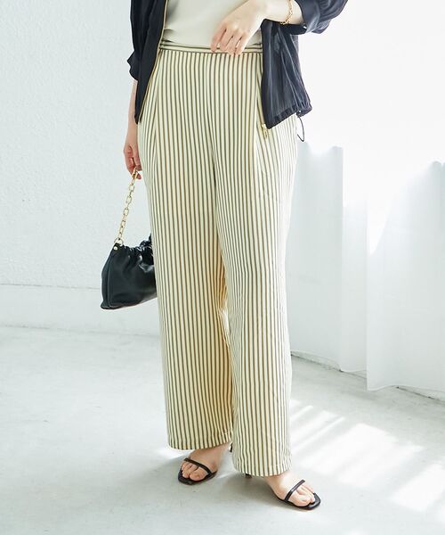 爽やかなストライプ柄がスタイリッシュで初夏のコーデにぴったりのパンツです。 ラフな雰囲気でさりげなくトレンド感を取り入れたコーデが楽しめます。 ●ポイント 凹凸のあるストライプ状の模様が特徴のサッカー素材を使用しています。 肌離れが良く、暑い夏も快適に着用していただけます。 ポリエステル100%でシワになりにくく、ホームクリーニング可能です。 ウエストは一周ぐるっとゴムを入れているのでフィット感がありながらも楽な履き心地です。 ●おすすめコーデ シアーニット合わせるラフなスタイルはもちろん、コンパクトなTシャツを合わせたメリハリのあるコーデもおすすめです。 【スタッフ着用コメント】 〈スタッフA〉 30代/161cm/骨格ウェーブ/普段サイズ36‐38/着用サイズ38 サイズ感:ウエストゴムがちょうどよく、着丈もジャストサイズです。 素材感:軽く、ポコポコした生地感が涼しげです。 着用感:裏地が付いているので透け感気にならず、ストライプ柄がワンポイントにかわいいパンツです。 ※取り扱いについては、商品についている洗濯表示にてご確認下さい。 ※照明の関係により、実際よりも色味が違って見える場合があります またパソコン・スマートフォンなどの環境により、若干製品と画像のカラーが異なる場合もございます。 ※商品の色味は、商品アップ画像をご参照ください。 【注意事項】 ・画像の商品はサンプルです。 ・サイズ表記はあくまで目安となります。 実際の商品と仕様、加工が若干異なる場合があります。