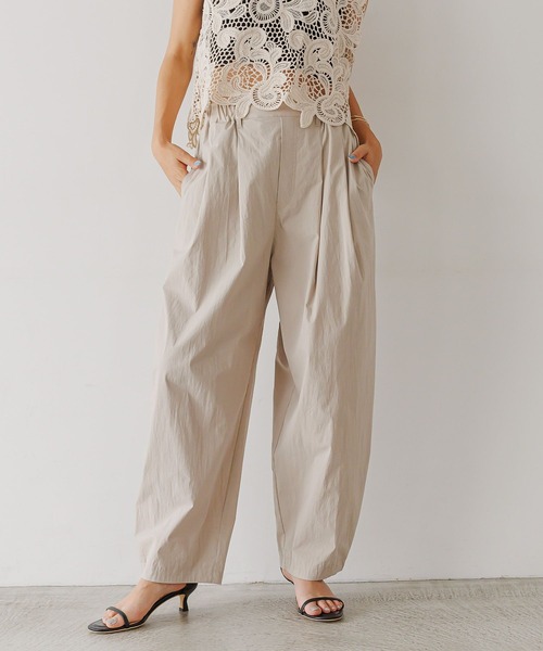 薄くて軽い素材感がアクティブシーンにもおすすめなコクーンパンツーーー★おすすめポイント★[1]ストレッチ入りで動きやすさ◎[2]綿ナイロン素材で薄くて軽い[3]トレンドのコクーンシルエット[4]着用しやすいベーシックなカラー展開ーーー[fabric]綿ナイロン素材のストレッチ入りパンツ。薄くて軽く、表面のワッシャー見えが特徴。グレージュとブラック、ベーシックカラーの展開。[design]タック入りコクーン型ウエストイージーデザイン。フロントはすっきりさせた、トレンドデザインでもあるタックコクーンシルエット。[styling]ALLトップスコーディネート可能。ショート丈のリネンシャツと合わせたり、ロゴTやフォトT合わせもおすすめ。※屋外での撮影画像は光の加減で実際の商品より明るく見えたり、風合いが異なって見える場合がございます。 商品の色味はスタジオ撮影の画像を参考にして下さい。-------------------------------------≪お買い物をよりお楽しみいただくために≫◆商品のお気に入り登録(ハートマークをクリック)完売カラーの再入荷通知や、完売間近の通知、セールの通知も受けることができます。◆ブランドのお気に入り登録新商品や再入荷など、いち早くブランドのお得な情報を受け取ることができます。-------------------------------------