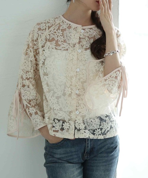 【アイテム】シアー生地に花柄の刺繍が重ねられた、纏えばたちまち華やぐ大人なブラウス。レトロな印象を纏う花柄レースの刺繍が全面にデザインされ、どこから見てもキュンとする乙女心を鷲掴みにする一枚。ノーカラーの首元でお顔周りをスッキリとさせ、ハイネックインナーとの相性も抜群。袖口に深めのスリットが入ったスリーブは、フレアなシルエットを演出し、上品さを加速させ、リボンが愛らしいキャッチーなアクセントに。ボタンで開閉可能だから、羽織りとしても活躍し、ヘルシーな肌見せアイテムでレイヤードスタイルを存分に楽しめます。短過ぎず、長過ぎない絶妙な丈感でボトムスを選ばず、綺麗めには勿論のこと、カジュアルなアイテムとも相性抜群です。【シーン】お出かけ、旅行、ランチ、女子会、オフィス、お呼ばれ、パーティーに活躍します。【体型カバー】ゆったりとしたシルエットで二の腕、ウエストの体型カバーができます。※お使いのディスプレイにより色味が異なって見える場合がございます。ご了承の上お買い求め下さい。※他のキャンペーンにより、期間中に価格が変動する場合があります。☆『お気に入り登録』でお得な情報がいっぱい☆■「商品のお気に入り登録」で再入荷通知や、在庫残り僅かの通知、セール通知も受け取ることができます。■「ブランドのお気に入り登録」で新商品や再入荷など、お得な情報を受け取ることができます!是非ご登録くださいね☆