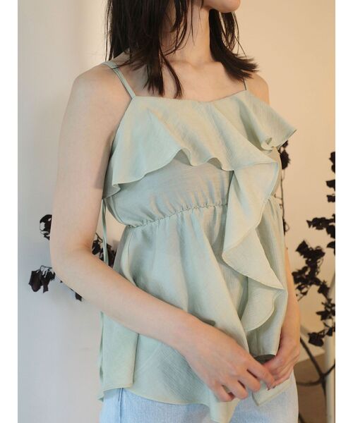 ■デザインポイント 胸元のラッフルフリルがトレンドライクなキャミブラウス。 イレギュラーヘムを採用し、腰周りが綺麗にカバーされる丈感に拘りました。 肩紐は結んで長さを調節できる仕様にしており、 インナーとレイヤードしてパンツと合わせるだけで旬のスタイリングが完成するアイテムです。 素材は程よい軽さのある天然調合繊素材で、暑い時期でも涼しく着用していただけます。 【修正コメント】 身幅が1センチ、ウエストのゴム上がりが1センチ大きくなります。 ■スタイリングポイント ・テーパードの形のパンツやタイトスカートと合わせるとバランスよく着用いただけます ・スカートでオフィスカジュアルに、OFFの日はデニムパンツでカジュアルなお出かけシーンにもぴったり ・きちんと感を更に出したいときはテーラードジャケットがおすすめ --------------------------------------------------- 透け感:なし 裏地:なし 生地の厚さ:薄手 洗濯:手洗い可 伸縮性:なし ジップ:なし ポケット:なし ---------------------------------------------------