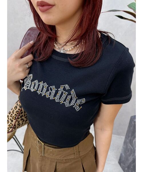 スタッズで入れたグラフィックと 配色ステッチがポイントのコンパクトTシャツです。 伸縮性のあるスムース生地を使用しております。 トレンドのスタッズを使用したグラフィックで エッジが効いているデザインです。 2色のスタッズを使用しています。 ハイウエストボトムやワイドボトムとの相性が抜群です。 ■ロゴの意味 Bona fide=正真正銘の。本物。(ラテン語)