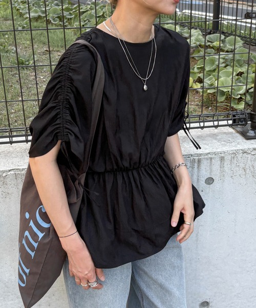 ◆Detail キレイめやカジュアル、少しカチッとしたシーンにもマッチしてくれる汎用性の高い着回しトップス。 肌当たりの柔らかいレーヨン混のやや光沢のある生地を使用し、さらに表面には細かなシボ感がありシワも目立たないのもデイリー使いしやすいポイント◎ 肩から腕にかけてはドロストでギャザーを寄せることのできるデザイン。 二の腕をしっかりカバーしたい場合は、ギャザーを緩めることで調節も可能です。 ウエストの切り替え部分はゴムになっているため着脱しやすいうえ、スッキリ見え効果も。 ◆Fabric ----------------------------------------------- 透け感:なし(アイボリーややあり) 伸縮性:なし 光沢:微光沢 生地の厚さ:★★★☆☆ ----------------------------------------------- ※汗や水、摩擦により他のものに色移りすることがありますのでご注意ください。濃色製品は色移りすることがありますので、他の物と分けて洗濯してください。 ※生産時期によりサイズや質感・色味に若干の個体差がみられる場合がございます。 ※商品画像は、光の当たり具合やパソコンなどの閲覧環境により、実際の色味と異なって見える場合がございます。 予めご了承ください。 ※着用、お取り扱いの際は、商品についている品質表示とアテンションタグを必ずご確認ください。 ◆Information 欲しいitemをお気に入り登録(♡マークをclick) ・お買いのがし対策…完売itemの再入荷やラスト1点の情報をお知らせ ・欲しいitemをお得にget…pricedownになったらいち早くお知らせ ・スムーズ検索…ZOZOのお気に入りアイテムページで簡単checkできるから、再検索不要♪