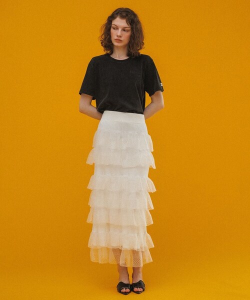 ◇2025春夏◇ ADAM ET ROPE' FEMME 【Material】 スカート:レーヨンナイロンの糸を使用した、適度な厚みのある裏総針編みニット フリル:透け感の出る糸で編み立てたレース編みのフリル 【Design】 フリル感で華やかに着映えるニットスカート。 スカートの編み地は伸縮性があり、ウエストのゴム仕様でストレスフリーな着用感。 フリルは段々に配して、スタイルアップのバランスが計算された1着。 フリル編みの表情のあるギャザーデザインが、きれいめになりすぎずモードに甘く着こなせるように仕上げたアイテム。 【Color】 モードなフェミニンさを演出できるブラック、ホワイト、ブラウンの3色展開。 【Styling Point】 シアートップスやシャツ、スウェットなどウエストインもアウトも幅広いトップスと好相性。 足元はスニーカーで外したり、サンダル合わせもおすすめ。 オンオフ着回しが楽しめるニットスカート。 --------------- 透け感:スカート本体無し、フリル部分透け感あり 裏地:なし 伸縮性:あり 光沢感:なし 生地の厚さ:スカート→中肉、フリル→薄手 ポケット:なし --------------- ◇モデル情報 身長:166cm size:F 身長:170cm size:F(ロングヘア)