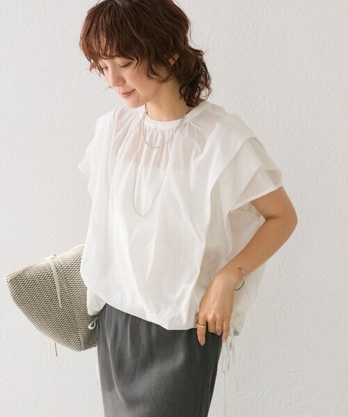 華やかな袖のタックで二の腕もカバー●デザイン1枚で着映えが叶う、着回しもしやすい大人のブラウス。袖に入ったタックが華やかさもありつつ、二の腕をすっきり見せてくれます。裾のドロストで着丈のバランスも調整可能。身長やボトムのデザインを気にせず合わせていただきやすいアイテムとなっております。きれいめがお好きなお客様には、タックワイドスラックスやタイトスカート、カジュアル好きなお客様には、デニムやカーゴパンツ系とのスタイリングがオススメ!様々なボトムと相性が良く、テイストを選ばず着まわせる一枚です。●素材綿 100%・通気性がよく肌なじみの良い素材洗濯方法:手洗い可透け感:オフホワイトあり裏地:なし伸縮性:あり(裾のドロスト部分)生地の厚さ:やや薄い光沢:なし--------------------------------------------------------------------------------【お買い物をもっと便利に楽しく♪】『♡』をクリックでお気に入り登録✓「商品のお気に入り登録」で・・・ラスト1点や再入荷の通知が届きます。登録して頂いた商品だけが対象となる、あなただけのタイムセールが開催されることも!✓「ブランドのお気に入り登録」で・・・新商品や再入荷など、いち早くブランドのお得な情報を受け取ることができますので、ご登録をおすすめします!--------------------------------------------------------------------------------【注意点】※画像の商品は光の照射や角度、お使いのモニター環境により、 実物と色味が異なる場合がございます。※入荷状況により、お届け予定が前後する場合があります。※お客様への発送が店頭販売より遅れる場合もあります。※追加生産商品は、一部の店舗、通販で販売中の場合がございます。 予めご了承下さい。----------------------------------------------------------------------