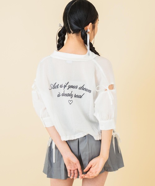 さりげないリンク感が、日常をちょっと特別に。●肩にあしらったリボンディテールが、甘すぎず程よい可愛さをプラス。●シアー素材ならではの軽やかさが、暑い季節にも爽やかな印象を演出します。●背中のロゴプリントが、後ろ姿まで抜かりないアクセントに。♦detailふんわりとしたボリューム袖にリボンを添えたフェミニンなデザイン。程よい透け感のシアー素材は、インナーとのレイヤードが楽しめるのも魅力です。裾のドローストリングでシルエットの調整も自由自在。親子でリンクコーデを楽しめるさりげないデザインだから、特別な日にもデイリーにも活躍します。♦styling〇きれいめカジュアル→シンプルなテーパードパンツに合わせて上品にまとめて。〇ガーリー→プリーツスカートと合わせてフェミニンムードを高めて。〇アクティブカジュアル→デニムショートパンツにキャップをプラスして、元気な休日スタイルに。♦コーデにオススメクラッシュ デニム プリーツ スカート【キッズお揃い】 911-7647ベルト付 プリーツ スカート 911-7397-----------伸縮性・・・あり透け感・・・あり光沢感・・・なし生地の厚さ・・・薄めポケット・・・なし裏地・・・なし-----------<サイズ>XS(135cm~145cm)S(145cm~155cm)M(155cm~165cm)※商品のお取扱いに関しましては、商品に付属のアテンションカード、洗濯ネームをご覧ください。※モデル着用画像は光の当たり具合で色味が違って見える場合がございます。※商品の色味の目安は、商品単体の画像をご参照ください。【お買いものをお楽しみいただく為に!】▼商品のお気に入り登録完売カラーの再入荷通知や、ラスト1点の通知、セールの通知も受け取ることができます。▼ブランドのお気に入り登録新商品や再入荷など、いち早くブランドのお得な情報を受け取ることができます。