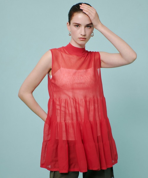 【allureville 2025 autumn&winter】 ミドル丈のシアーティアードチュニック。 清涼感あるドライタッチなシアーニットに、デコラティブなギャザーがデザインポイント。 デニムパンツのようなカジュアルなボトムスに着回ししやすくなっております。 ノースリーブのシルエットなので、夏に活躍する1枚です。 夏らしさのあるカラー展開。 【スタッフコメント】 ティアードデザインが素敵なチュニック。 透け感のある薄手の素材で、ヘルシーな抜け感スタイルに。 シワになりにくく、さらっと着やすい一枚です。 少し高さのあるモックネックで大人っぽい印象に。 ティアードの切り替え位置が高めにあり、ウエスト位置を高く、スタイルアップして見せてくれます。 上からベルトをしてもおしゃれに決まります。 ヒップが隠れるくらいの丈感で、気になるウエスト周りやヒップ周りを上手にカバーします。 ワイドパンツやストレートパンツ、タイトスカートなど落ち感のあるすっきりラインのアイテムと合わせるとバランスが良いです。 甘さが苦手な方はパンツ合わせがおすすめ。 ※照明の関係により、実際よりも色味が違って見える場合がございます。 またパソコン・スマートフォンなどの環境により、製品と画像のカラーが異なる場合もございます。 予めご了承ください。