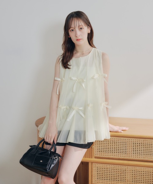 ▪︎detail 大人可愛いリボンたっぷりのブラウスが登場♡ リボンをふんだんにあしらい、360度どこから見ても可愛さ抜群 一枚で着映えする主役級トップス フレアシルエットでお腹や腰回りの体型カバーも◎ ▪︎fabric ふわっとエアリーで軽やかなシースルー素材 シアー感が肌を美しく見せフェミニンさを+ 裏地付きで着心地よく夏場でも涼しくご着用いただけます ▪︎styling フレアシルエットなのでボトムスはすっきりとまとめるのがオススメ ショートパンツやフィットフレアデニムなどとの相性◎ タイトスカートと合わせてレディライクなコーデもgood ____________________ 透け感: やや有り 裏地: 有り 伸縮性: 無し 生地の厚さ: 薄手 光沢感: 無し ____________________ ▪︎公式Instagram @ecrel_official YouTubeでÉCREL director renaが アイテム紹介や着回しを更新しております。 ぜひご覧くださいませ。(@rena_yoshitsugu) ▪︎アイテムのお気に入り登録(♡をクリック) 再入荷、ラスト1点、お得なタイムセールの通知を受け取れます。 ▪︎ブランドのお気に入り登録 新商品や再入荷など、ブランドの情報をいち早くお知らせいたします。 ※ご注文いただいた予約商品のお届け時期の確認は、注文履歴ページより行えます。 ※照明環境により、実際の商品の色味とカラー別画像の色味に若干の違いが発生する場合がございます。 詳細画像と併せてご確認の上、ご注文いただきますようお願い致します。