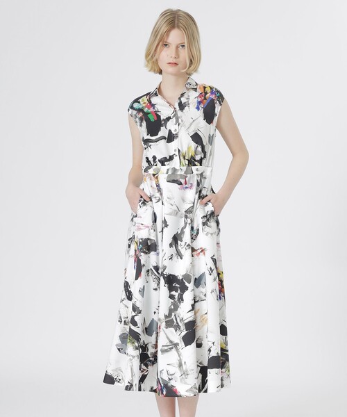 グラフィックが映えるシャツワンピース【素材】佐々木香菜子氏が作成したアートワークをプリントしたオリジナルテキスタイル。ソフトな風合いとリュクスな光沢感が魅力のツイル素材。ドレープ感があり、軽くて肌触りも良くさらりとした着心地です。しわになりにくく、ご自宅で洗えるイージーケアもうれしいポイント。【シルエット / デザイン】スキッパー衿が首元をすっきりと見せ、フィット&フレアーのシルエットが上品な印象のシャツドレス。ウエスト位置を高めに設定しており、脚長効果も期待できます。ウエストにはアジャスター釦を配置。奥に留めるとカシュクールのように美しく重なり、自然な立体感が生まれます。ウエスト後ろはゴム仕様なので、ストレスフリーな着心地も実現しました。【スタイリング】1着でコーディネートが完成されるワンピース。キャッチーなプリントが、着こなしに華やかさをプラスしてくれます。ジャケットやショート丈のカーデともバランス良く、一点投入で主役になる存在感のあるアイテムです。アーティスト佐々木香菜子氏とのコラボレーションコレクション「LOVE」普段見えないたくさんの小さな「たいせつ」のカケラたち。そのカケラたちに気付き、一つに集まった時、大きな「LOVE」ができあがる。そんな今と未来をつなぐ温かく幸せなLOVEをテーマに作品を制作しました。佐々木香菜子1983年宮城県仙台市生まれ。ダイナミズムと繊細さを兼ね備えた表現で、数々の作品を生み出している。人間存在そのものへの探求が制作の原動力となり、普遍的な美と内面の葛藤を行き来する哲学的な旅路が制作を通して続いている。また広告ビジュアルやアパレルブランド、企業とのコラボレーション、ライブペイントを数多く手がけ、アートワークとクライアントワークの境界を超え、表現の可能性をさらに広げている。━━━━━━━━━━━━━━━━━━━━━━━━━━お買い物をお楽しみ頂くために<商品のお気に入り登録>完売カラーの再入荷通知など、お得な情報をお届けします。<注意事項>この商品はサンプルでの撮影を行っています。実際の商品とイメージが異なる場合がございます。撮影環境により、光の当たり具合で色味が違って見える場合があります。あらかじめご了承下さい。