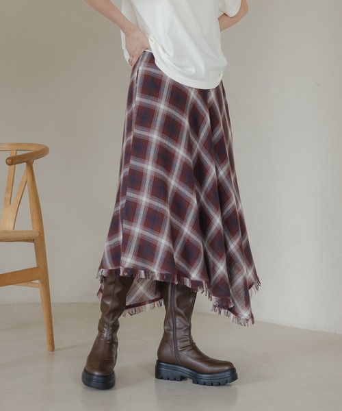 ■素材 今期イチオシの楊柳ガーゼのチェック素材。 糸の形状から拘り、まるでサマーウールのような肌触りの良さを表現しています。 撚りを強くする事で清涼感をもたせ、肌離れもとても良く、夏場からで秋まで快適に着こなして頂けます。 色のグラデーションが特徴のオンブレチェックなので取り入れるだけで秋を先取りできる1着になっています。 ■デザイン オンブレチェック柄のイレヘムデザインスカート。 裾の長さがアシンメトリーになっていて歩くたびに動きがでます。 裾の端がフリンジになっているのもさりげないポイント。 素材は軽いですが秋を感じる配色のチェックなので一足早く秋気分を取り入れやすい一枚です。 ウエストは後ろのみゴム仕様で左脇にファスナー付きです。 ■スタイリング Tシャツやシャツなどカジュアルなアイテムとの合わせがバランスよく着こなせます。 同素材のビスチェとのセットアップもおすすめです。 サンダルはもちろん、秋になったら足元をブーツで合わせるとよりムードが高まります。