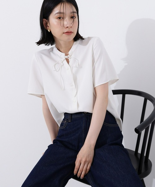 首元にあしらった共地の華奢なリボンタイがポイントになったブラウス。身頃と袖はすっきりとしたデザインにし、襟の甘さを中和することで大人っぽいバランスに見せてくれるので、ONもOFFスタイルにもおすすめ。1枚で着るのはもちろん、ジャケットインにも使いやすいシルエットです。デニムを合わせればOFFカジュアルにも着ていただけます。<素材>肌触りが心地よい合繊素材を使用。ジョーゼットの表面が上品なトロミ素材でシワになりにくく扱いやすい素材です。<詳細>仕様・前ボタン裏地・なし透け感・ややあり / 光沢・なし / 伸縮性・なし生地の厚さ・普通●取り扱いについては、商品についている品質表示でご確認ください。●撮影はサンプル商品で行っている為、仕様とサイズが異なる場合がございます。●スタジオ及び屋外で撮影した着用画像は、光の当たり具合やご覧のモニターによって色味が違って見える場合があります。予めご了承ください。●生産時期により色・素材・サイズ感など多少異なる場合がございます。予めご了承ください。〇返品・キャンセルについて・着用・洗濯後の返品・ご交換は致しかねます。・商品到着後、着用または使用前に商品を確認して頂きますようお願い致します。≪お買い物をよりお楽しみいただくために!≫・「商品のお気に入り登録」再入荷通知や、ラストの通知、セール通知も受け取ることができます。・「ブランドのお気に入り登録」新商品や再入荷をはじめ、タイムセールやクーポンなどいち早くブランドお得な情報を受け取ることができます。