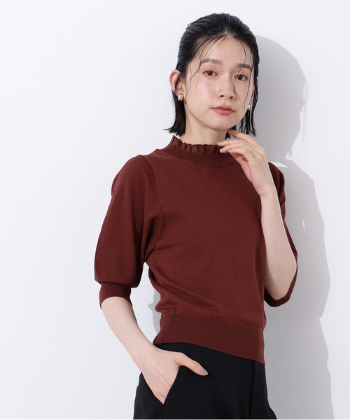 襟ぐりにあしらった布帛フリルが効いたデザインニット。 ブラックとライムは白襟を付けてバイカラーに、ブラウンはニットと同色の襟を合わせています。 袖はフォルム感がありますが、甘さを抑えたスリーブデザインで大人も着やすい仕上がりに。 コンパクトにまとめたデザインは、ボトムスにインもアウトも可能。フィットしすぎないシルエットなので夏でも着やすいアイテムです。 <素材> 通年使えるハイゲージにストレッチ糸を引き揃えた編地。 襟ぐりはプリーツをかけたシャツ地ライクな合繊素材を使用しています。 <詳細> 仕様・開閉なし 裏地・なし 透け感・なし / 光沢・なし / 伸縮性・あり 生地の厚さ・普通 ●取り扱いについては、商品についている品質表示でご確認ください。 ●撮影はサンプル商品で行っている為、仕様とサイズが異なる場合がございます。 ●スタジオ及び屋外で撮影した着用画像は、光の当たり具合やご覧のモニターによって色味が違って見える場合があります。予めご了承ください。 ●生産時期により色・素材・サイズ感など多少異なる場合がございます。予めご了承ください。 〇返品・キャンセルについて ・着用・洗濯後の返品・ご交換は致しかねます。 ・商品到着後、着用または使用前に商品を確認して頂きますようお願い致します。 ≪お買い物をよりお楽しみいただくために!≫ ・「商品のお気に入り登録」 再入荷通知や、ラストの通知、セール通知も受け取ることができます。 ・「ブランドのお気に入り登録」 新商品や再入荷をはじめ、タイムセールやクーポンなどいち早くブランドお得な情報を受け取ることができます。