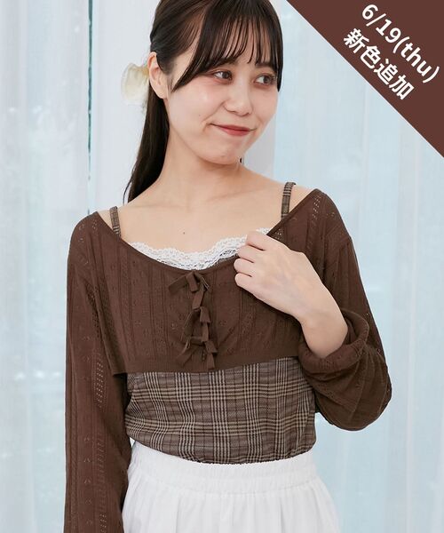 大人の甘さを演出する、透かしニット×キャミセットが登場。■デザインさらっとした肌触りが心地良いニット素材を使用。真夏でも快適に着られる、軽やかな着用感が魅力です。繊細な透かし柄が抜け感をプラスし、胸元のリボンが顔まわりを華やかに演出。キャミソールにはレースとリボンをあしらい、1枚でも着映えするのが嬉しいポイントです。■サイズ感キャミソールはセットインできる丈感です。伸縮性のあるカットソー生地を使用しているので、ボディラインに程よくフィットします。※ニットのネックポイントからの着丈:34cm■スタイリングセットで着るのはもちろん、それぞれ単品でも着回せるので様々なスタイリングが楽しめます。デニムと合わせれば、上品で大人っぽい印象に。スウェットパンツでカジュアルダウンすれば、今年らしい抜け感のあるコーデに仕上がります。スカートを合わせると、女性らしいフェミニンスタイルにも◎ニットトップスはボレロ丈なので、ワンピースに羽織ればバランス良くまとまり、スタイルアップ効果も期待できます。・・・・・・・・・・・・・・・・・・・・・・透け感:あり(ニット)裏地:なし伸縮性:あり光沢感:なし生地の厚さ:薄手(ニット) 普通(キャミソール)・・・・・・・・・・・・・・・・・・・・・・■商品のお気に入り登録 再入荷通知やのこりわずか、お得なプライスダウンの情報も受け取ることができます。ぜひご登録ください◎※サンプルでの撮影の為、製品と仕様が異なる場合がございます。※商品の色味は、撮影場所や光のあたり具合などにより色味が違って見える場合がございます。また、お客様のお使いのモニター環境などにより色味が異なって見える場合がございます。予めご了承の上ご注文下さい。