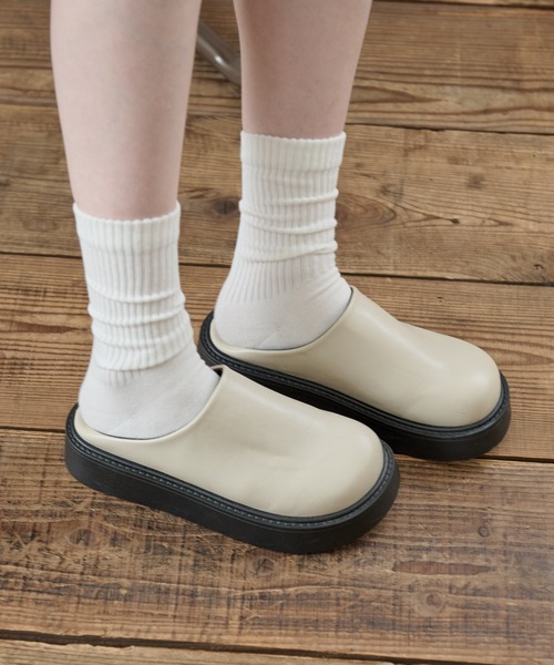 【洗練されたシックな印象のラウンドトゥローファー】 ・ぽってりとした丸みのあるフォルムがモードになりすぎず、スリッパのようにさっと履けるデザインがカジュアル感をプラス ・アウトソール全体に厚みがあるので、さりげなくスタイルアップしながらもフラットシューズのような安定感 ・上質なツヤ感のある合成皮革を使用し、上品な雰囲気に ~スタイリング~ 厚みのあるアウトソールでスタイルアップするのでショートパンツと合わせるのもおすすめです。 レースタイツやシアーソックスと合わせて春らしい足元にも◎ シンプルなデザインで合わせるアイテムを選ばずにお使いいただけます。 ※着用、お取り扱いの際は、商品についている品質表示とアテンションタグを必ずご確認下さい。 オールシーズン/スリッポン/ローファー