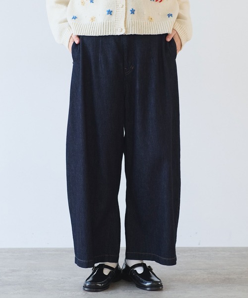 7.7OZのやわらかく軽いデニムでブルゾンとパンツをつくりました。見た目に反した軽さで、’’デニム=重い’’と思われている方にぜひ着ていただきたいです。’’ぽわん’’としたゆるめのシルエットでシリーズのデニムジャケットとセットアップの着用もおすすめ。生地の裏側は柔らかくなめらかな手触りなので、心地よく着ていただけます。============================透け感:なし裏地:なし伸縮性:なし光沢感:なし============================※素材の特性、お取り扱いの注意水洗い可・・・中性洗剤使用アイロン可・・・あて布使用・この製品は、インディゴ染料にて染めておりますので洗えば洗う程藍染め独特の鮮やかな色と風合が得られます。・特性として着用時(乾摩擦)や汗や雨等でぬれた場合(湿摩擦)色落ちし、他の衣料に色移りする事があります。・他の物に色移りした場合すぐにお洗い下さい。時間がたつと取れにくくなります。・手洗いは必ず単独で洗濯して下さい。(ドライクリーニングも同様)・綿素材の為、洗濯の際多少縮みますので形を整えてから陰干しで自然乾燥させて下さい。尚、乾燥機の御使用は絶対にお避け下さい。・ドライクリーニングは専門店へお願いします。bulle de savon(ビュルデサボン)BRAND CONCEPT女性、誰もが ふっと子供の頃を思い出し 少女のような気持ちに戻れる服。 bulle de savon =シャボン玉の事 石鹸の泡とか、においなど、 懐かしい感じ。設立年月日 1994年8月※インディゴブルーはサンプルです。実際の商品と仕様・加工・サイズ等が若干異なる場合がございます。※モデルの着用画像は光の関係で商品の色味が若干異なります。※取り扱いの注意については取り扱い表示をよくご確認の上、着用をお願いいたします。※工場の生産の都合上、入荷の時期が前後する場合がございます。ご了承ください。