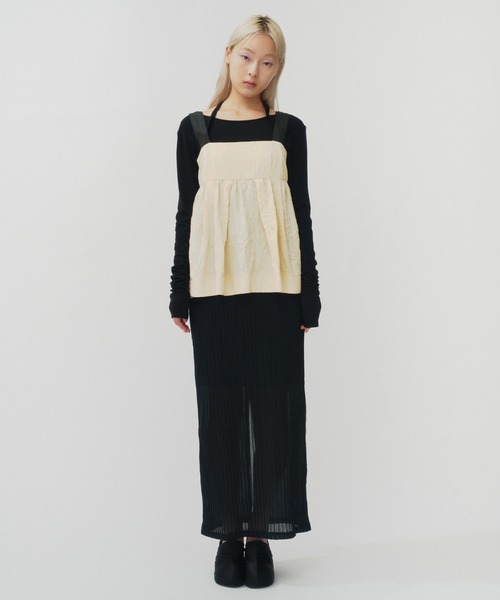 ★TTM 夏の新作★異素材のコントラストが美しいペプラムロングドレスコンパクトな胸元から裾へかけて広がるフリルは、フリル端の始末などの細部にこだわり、バランスのいいボリュームとシルエットに仕上げています。スカート部分は、上身頃とのコントラストを演出するため、シアープリーツ素材を使用し、すっきりと軽やかに仕上げています。 透け感:あり裏地:スカートのみあり伸縮性:あり光沢感:なし生地の厚さ:薄手 MATERIAL<上身頃>無地:表情豊かなワッシャー加工を施した高密度タフタ素材は、国際的な第三者機関の認証を取得したリサイクルポリエステル原料を使用し、トレンド性とサステナビリティを兼ね備えた素材となっています。<スカート>世界的にも希少な非常に古い編み機をさらに改造し、職人の技術を駆使して編立てしたトリコット素材。まるでプリーツ加工をしたかのような組織感が特徴です。また、環境に配慮したリサイクルポリエステルをブレンドしています。※画像の商品はサンプルです。実際の商品と仕様、色味が若干異なる場合があります。また 、パソコンやスマートフォンのモニター環境などにより、色味が違って見える場合がございます。予めご了承ください。※店頭及び屋外での撮影画像は、光の当たり具合で色味が違って見える場合があります。THINGS THAT MATTER (シングス ザット マター)まったく新しいアプローチで、コレクションを展開、感じることの大切さを伝えるブランド。クリエイティブディレクターにはデザイナー武笠綾子を起用。自分の内側に目を向け、自分を愛するきっかけになってほしい。自分を愛することで一人ひとりの魂が満たされ、エネルギーが整い、正しく循環することでこの星のすべてを愛することに繋がる。【 気になるアイテムはお気に入り登録をお勧めします!】♡マークをクリックし、再入荷やラスト1点の通知、セールなどのお知らせを受けることができ、お買い物が楽しめます。ブランドのお気に入り登録もぜひお願いします!※他のキャンペーンにより、期間中に価格が変動する場合があります。