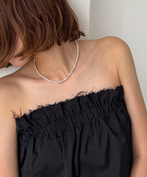 デザイン 不揃いなチャームデザインでこなれ感のあるネックレス。 適度なボリューム感があるので、デコルテやお顔まわりを華やかに彩ります。ゴムのように伸縮性があるので付け外しも簡単にできます。 コーディネート Tシャツやタンクトップなど、シンプルなトップスに合わせるだけでワンランクアップしてくれます。 【アクセサリーのお手入れ方法について】 空気中に含まれる成分や汗、皮脂などに反応し、時間の経過に伴い変色する事があります。 使用後は柔らかな布などで拭き取りを行うことで長くご愛用頂けます。 ※照明の関係により、実際よりも色味が違って見える場合があります。またパソコン・スマートフォンなどの環境により、若干製品と画像のカラーが異なる場合もございます。 ※商品の色味は、商品アップ画像をご参照ください。