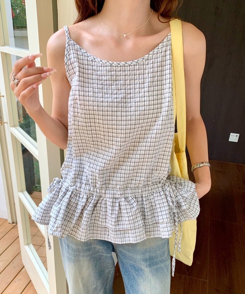 1枚で華やぐ♡夏映えする大人可愛いチェック柄キャミ!トレンド感抜群!ガーリー×カジュアルトップス★【Design-Styling】カジュアルにもフェミニンにも着こなせるチェック柄のキャミソール。軽やかな素材感と裾のフリルデザインが、夏のコーデにぴったりな一枚です。リラックス感のあるシルエットで、デイリーユースに活躍してくれます。【POINT】・トレンドのチェック柄で、シンプルながら存在感◎・裾のフリルがさりげなくガーリーな印象に・肩紐は長さ調整可能・一枚でもインナーをレイヤードしても◎着回し力抜群!・柔らかく軽い素材で着心地快適【Model】身長161㎝ ※照明の関係により、実際よりも色味が違って見える場合があります。またパソコン・スマートフォンなどの環境や、商品画像はサンプルのため生産時期により色味や素材、サイズ等の仕様に変更により、画像とは多少異なる場合もございます。予めご了承ください。evrycoco-お買い物をよりお楽しみいただくために-★商品のお気に入り登録完売カラーの再入荷通知や、完売間近の通知、セールの通知を受けることができます。★ブランドのお気に入り登録新商品や再入荷など、いち早くブランドのお得な情報を受け取ることができます。