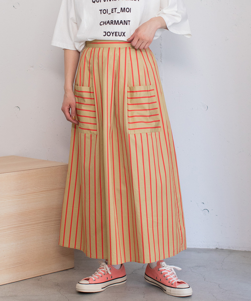 ■Pointオリジナルカラーのストライププリントが目を惹くスカート。タックギャザーのふんわりとしたボリューム感で、シンプルなトップス合わせもサマになります。左右にストライプを横使いしたパッチポケットをつけてアクセントにしています。ウエストはぐるりゴムの仕様、ひもでサイズ感の調節ができます。■Styling同素材の2511146969 ストライプバンドカラーボックスシャツとのセットアップもおすすめです。--------------------透け感:なし厚さ:普通伸縮性:なし裏地:なし--------------------◆注意事項◆可能な限り実物に近いカラーにて掲載しておりますが、ご使用のパソコンやスマートフォンなどの端末の環境によって、実際の色味と異なって見える場合がございます。予めご了承ください。サンプルで撮影している商品もございます。その場合、実際の商品とは色味・仕様が異なる場合がございますので、予めご了承ください。POU DOU DOU プードゥドゥひと手間加えた存在感のある「日常着」いつまでもときめきとかわいいを忘れない方への愛着を持てるワードローブ= お気に入り登録がおすすめ!=お得な情報をいち早くお届け致します。アイテムをお気に入り⇒ SALE START / 完売COLOR再入荷 / LAST1点 etc...ブランドをお気に入り⇒新商品 / 再入荷 /クーポン・セール情報 etc...